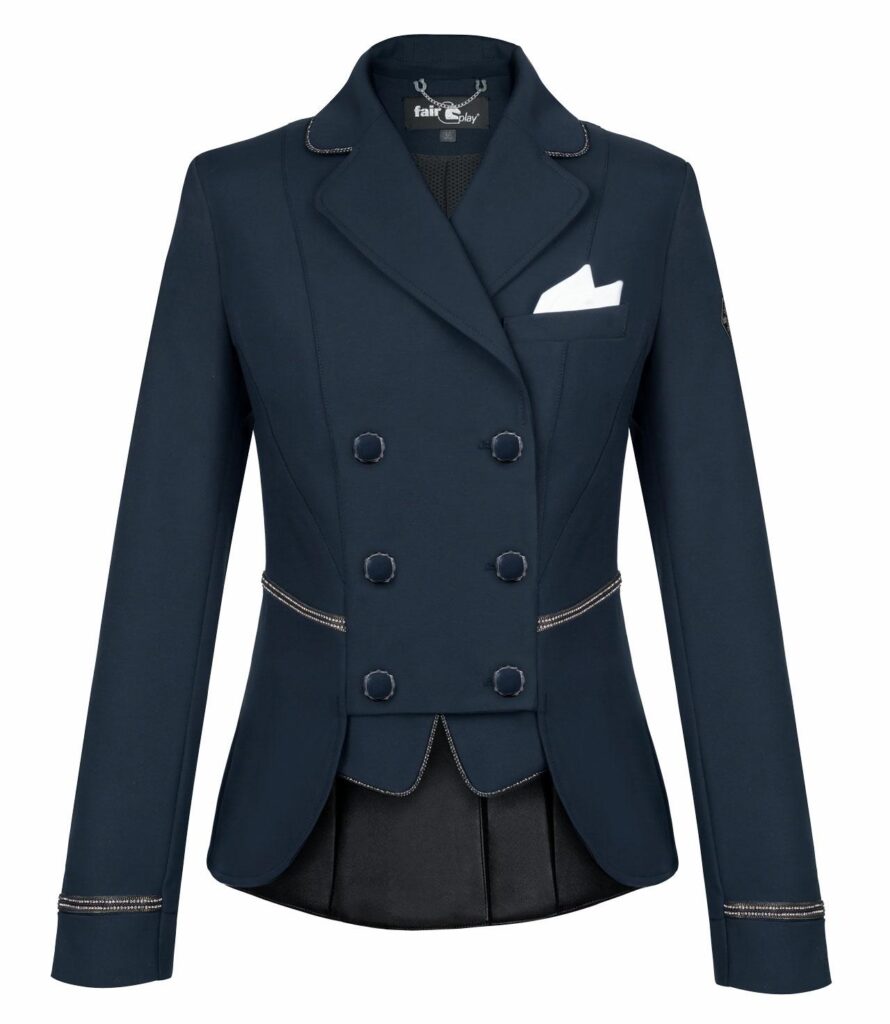 De Fair Play Florine is een chique korte slipjas met een dubbele rij knopen en is versierd met strass op de taille en de manchetten. Het rijjasje is gemaakt van een comfortabele elastische stof en heeft een mooie pasvorm.